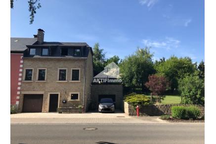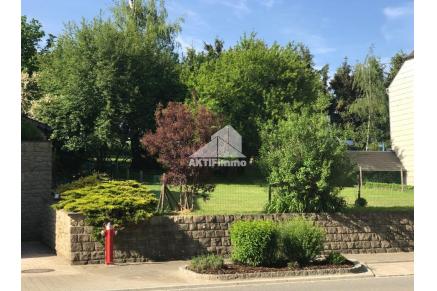 1er étage : (même niveau que le jardin situé à l'arrière et sur le côté) : Grand living room avec cheminée, cuisine équipée récente avec accès vers 2 terrasses, dont une couverte partiellement, débarras, WC séparé
